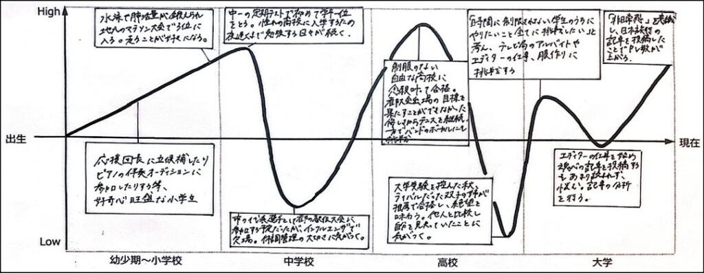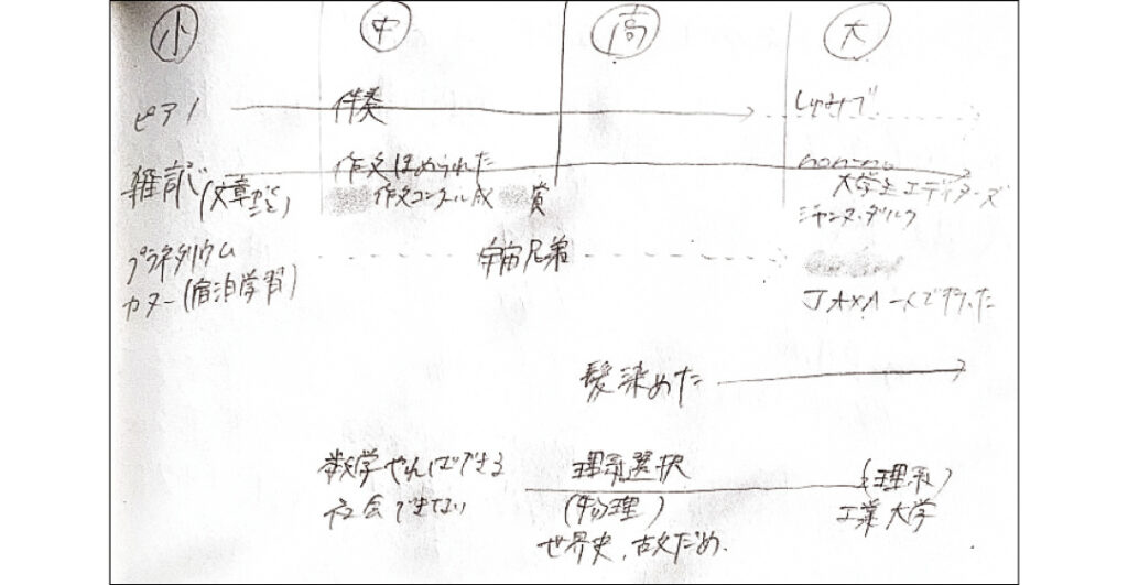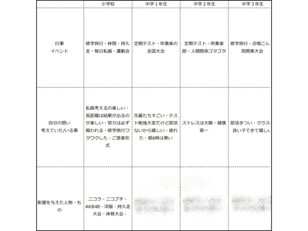 小学校までさかのぼり、それぞれの年代で①特に印象に残っている行事・イベント、②当時、自分が考えていたこと、③自分に影響を与えた人物・ものの3点をリストアップ。今の自分がどのように形成されてきたかが明確になり、きちんと言語化できるようになりました!(なぴっくさん)