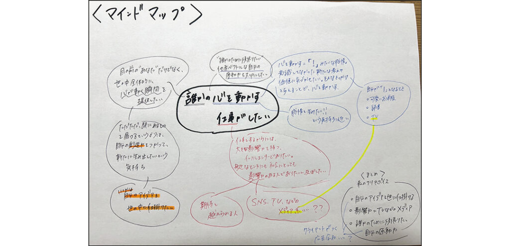「好きなことや、やりたいことが分からず、まずはそれを見つけたい!という人におすすめの手法。初めて試す人は、自分の名前を中央に、周りに好きなことを自由に書いて膨らませていきましょう。論理的に思考を深めていくのが苦手な人、クリエイティブな発想が得意な人にも向いています」(高橋さん)