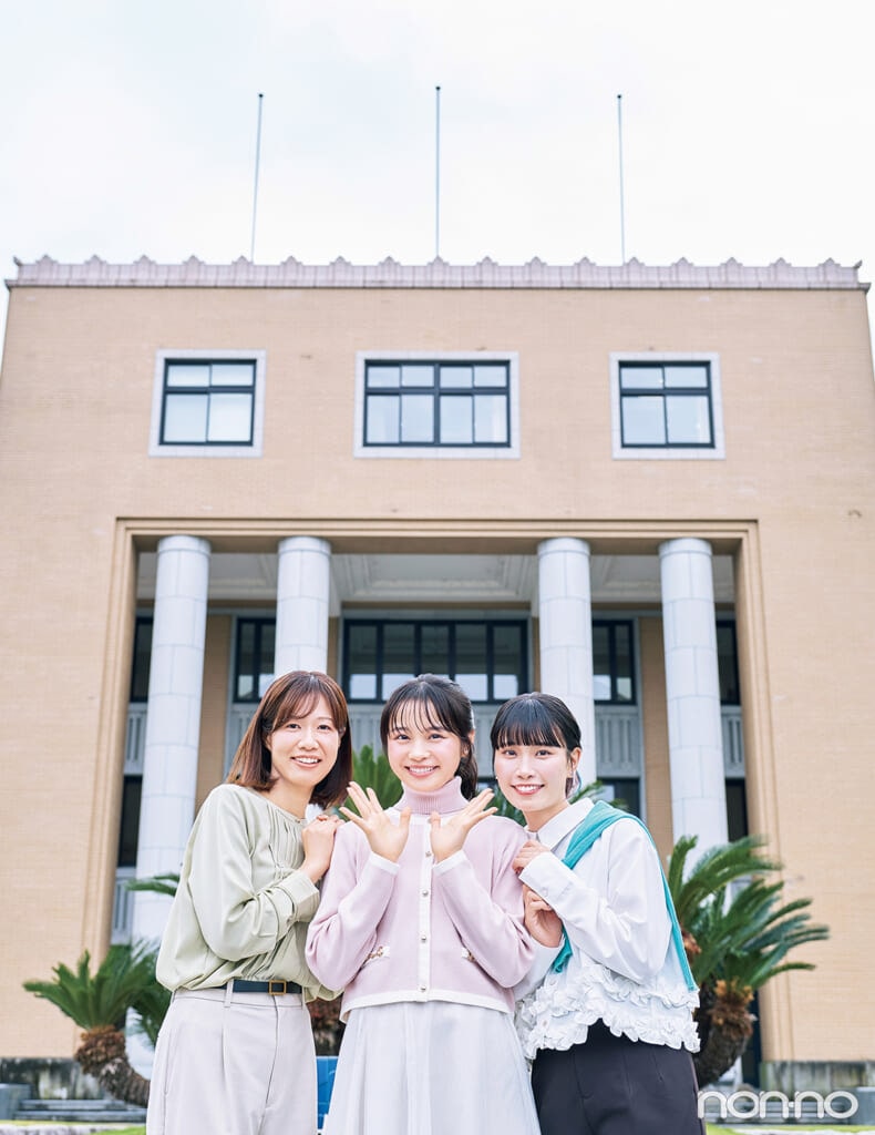 (左)林業職 佐賀県農林水産部 林業試験場 技師 寺戸このみさん(8年目)(中)ノンノモデル 林芽亜里(右)行政職 佐賀県SSP推進局 コンベンションチーム 主事 鐘ヶ江梨奈さん(5年目)