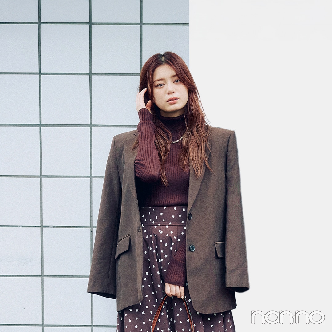 色濃度とドット柄でブラウンコーデに緩急を【大学生の毎日コーデ】