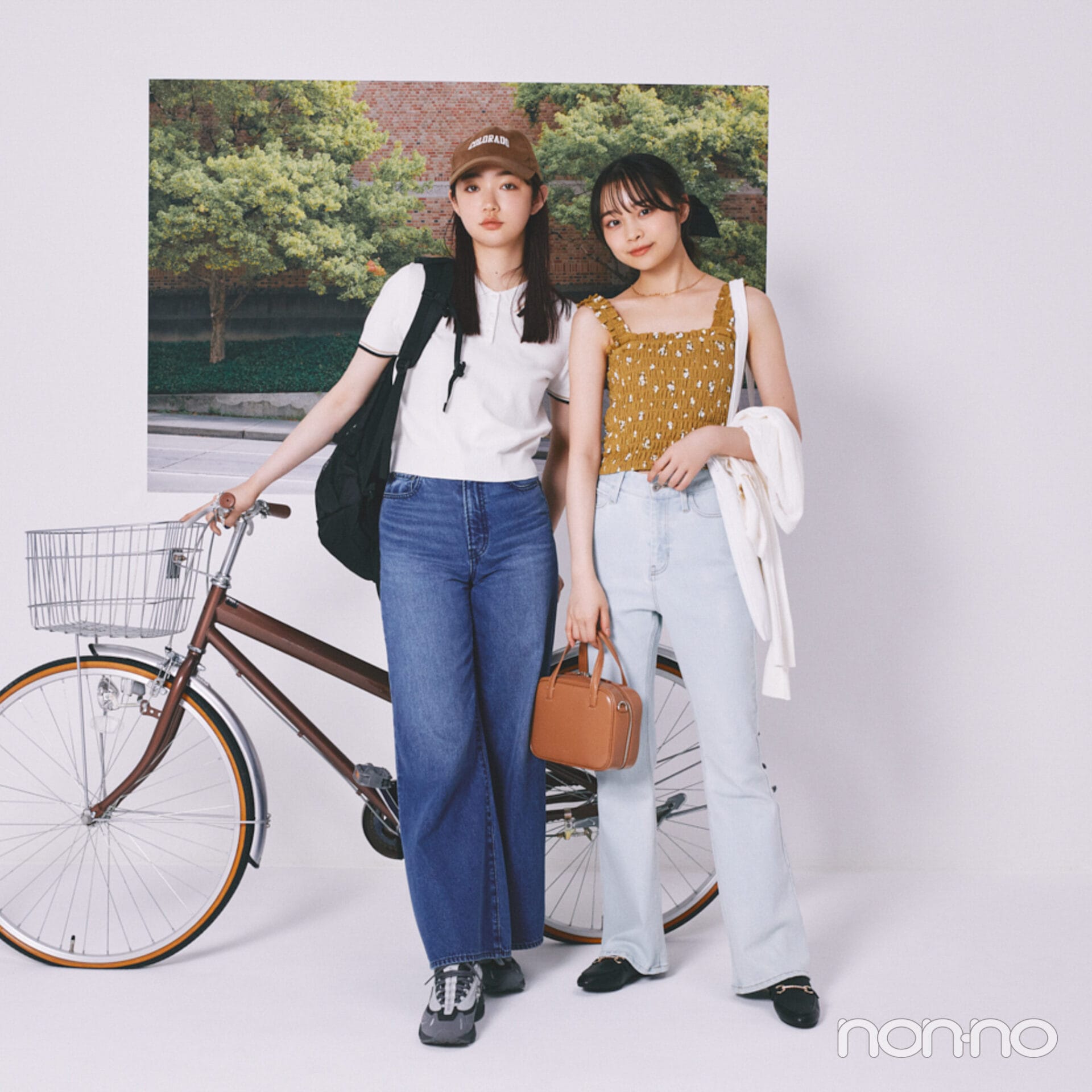 大学に行く日は楽ちんデニムをオシャレに仕上げて【フェミニン派 林芽亜里&カジュアル派 小宮山莉渚の夏休みイベントコーデ】vol.1