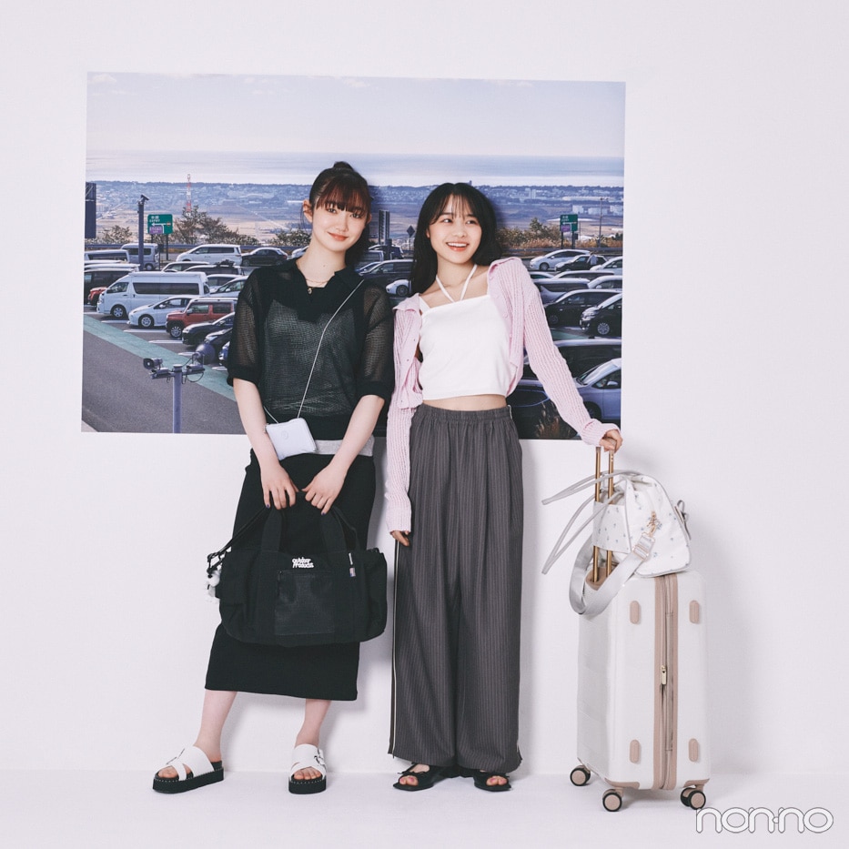 サークル合宿に行く日は長距離バスも快適なゆるボトムがポイント【フェミニン派 林芽亜里&カジュアル派 小宮山莉渚の夏休みイベントコーデ】vol.13
