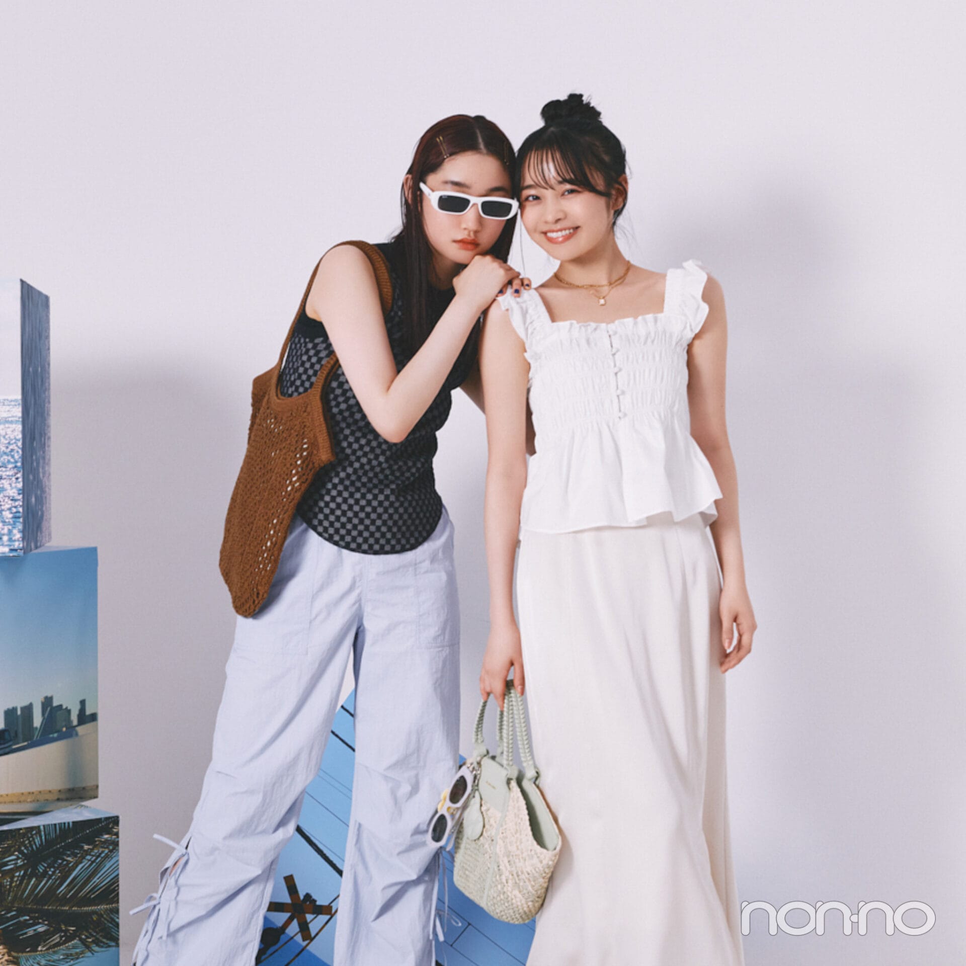 シワが目立ちにくいボトムで海ドライブへ【フェミニン派 林芽亜里&カジュアル派 小宮山莉渚の夏休みイベントコーデ】vol.3