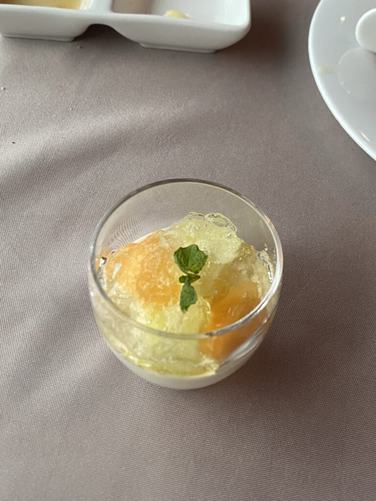 まずは1段目、ノンアルコールスパークリングワインを注いだメロンのスープ ヨーグルトソルベを添えて、メロンのパンナコッタです💡