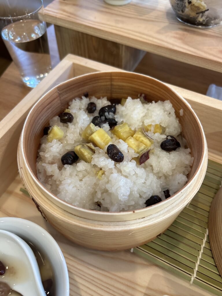 1段目のおこわは少し塩味がついており、サツマイモの甘さとお豆のホクホクとした食感が合いとても美味しかったです。