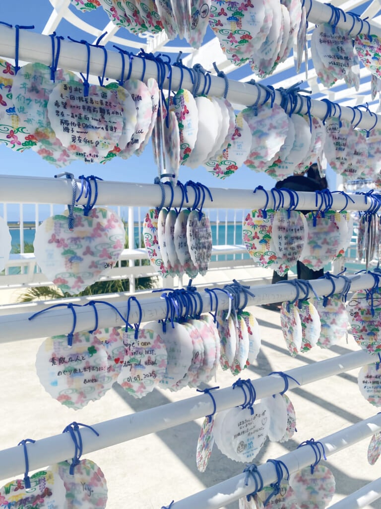 沖縄の伝統的な模様である紅型の模様の絵馬は、カラフルでフォトジェニック♡たくさんの恋する人たちの願いが書かれ、吊るされていました。