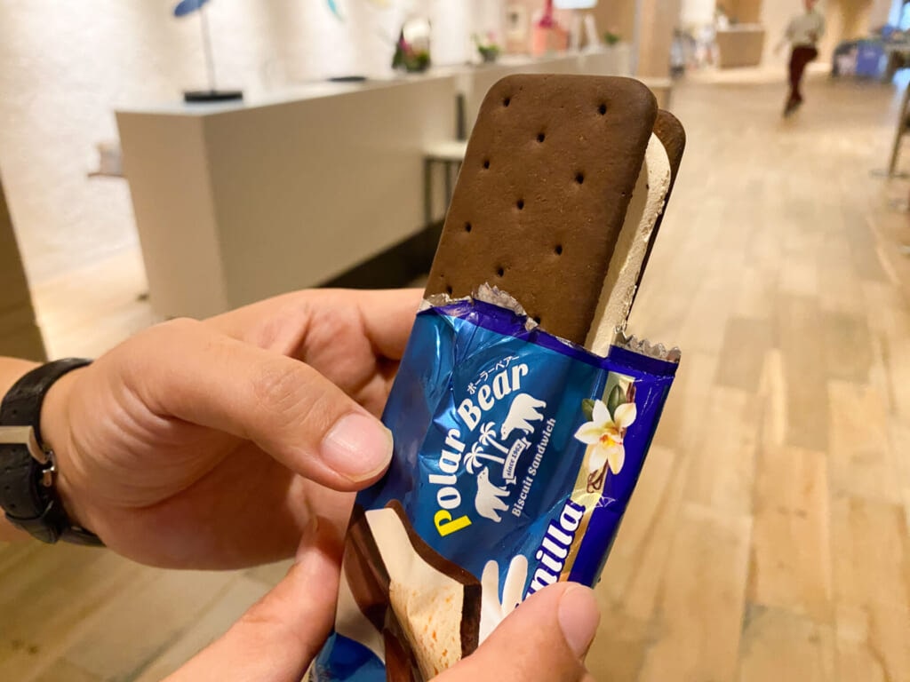 また、沖縄生まれの大人気アイスクリームブランド「ブルーシール」の商品も冷凍庫で販売。真夜中のおやつとして小腹を満たしてくれました。