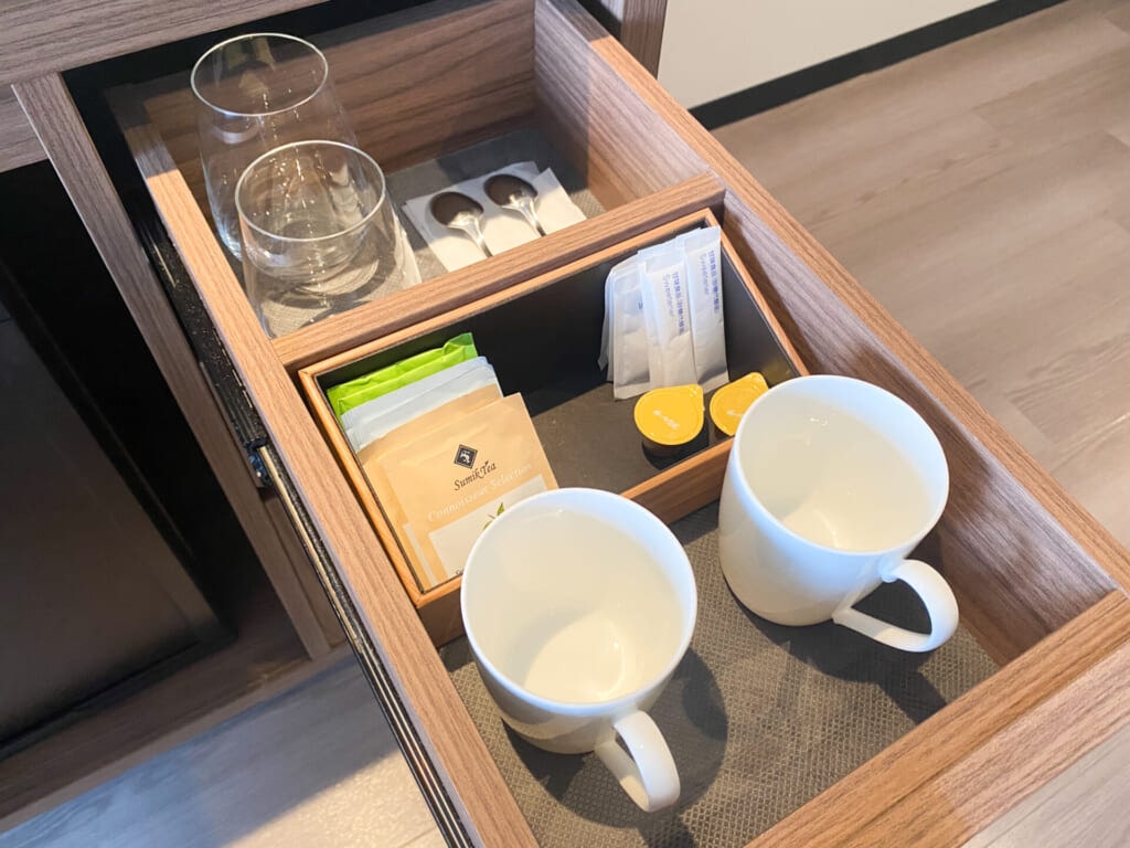 画像に写っている以外に、コーヒーマシーンや電気ポッド、ワイングラスなどの備えもありました。
