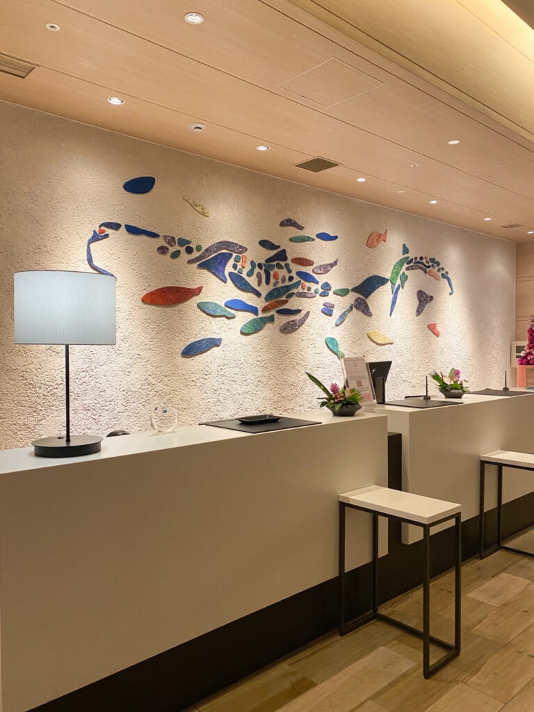 フロントデスクの奥には、海の中を連想させる涼しげなモチーフたちが。よく見ると、小さな模様が集まって、ジンベエザメを形作っています。