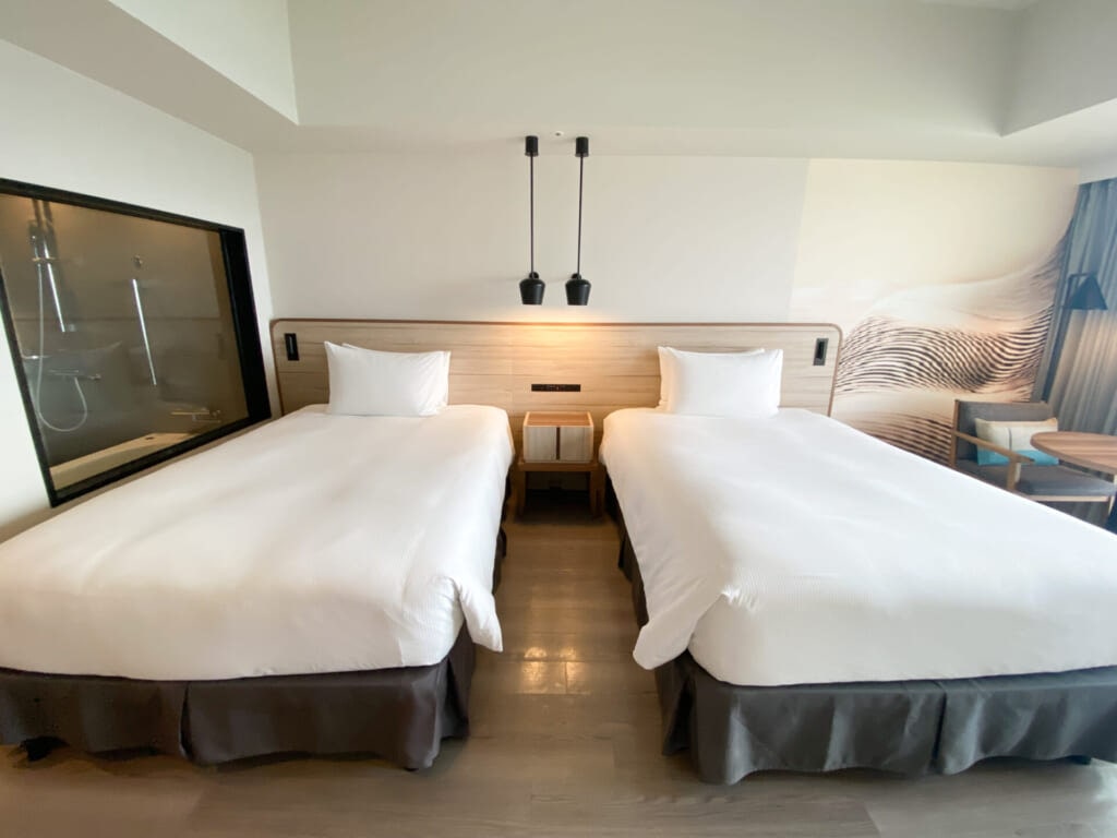 今回宿泊した客室は、2台のベッドが並ぶ【ゲストルーム オーシャンビュー(ツインベッド)】。オーシャンビューのバルコニー、窓際にはテーブルとソファも。
