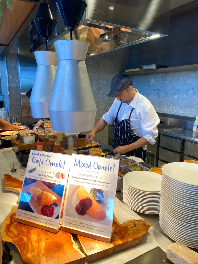 ホテル朝食の定番、目の前で完成させるオムレツは、沖縄らしくゴーヤ入りを選択可能。