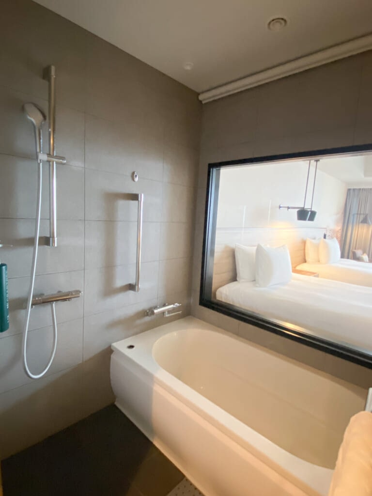 バスルームにも大きな窓があって開放的。バスルーム側からブラインドを閉じて、ベッド側から見えなくすることができます。