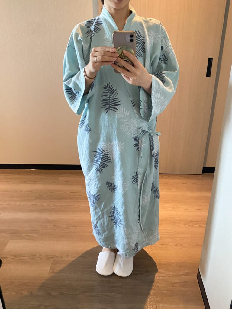 浴衣風のルームウェアはリゾート感あふれる絵柄。スリッパとあわせて、客室でのみ着用できます。