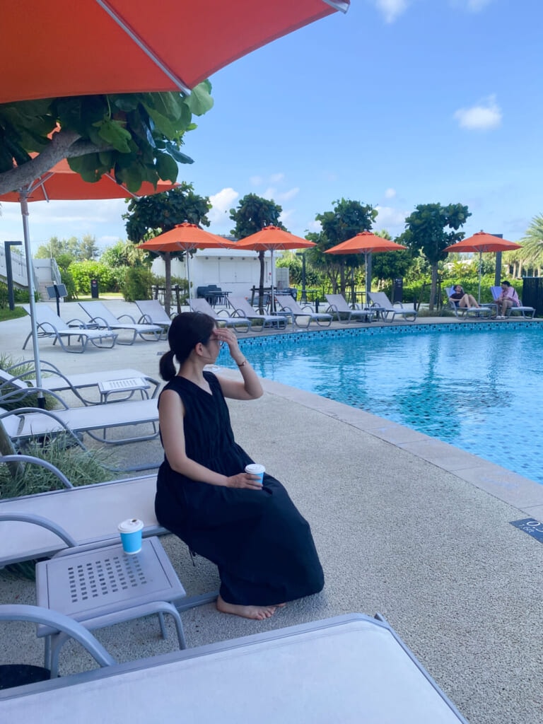 こんなふうに写真を撮りたいならぜひ朝早くに。10時にはプールサイドのチェアが埋まるくらい人が集まってきていたので、それ以前の時間帯が狙い目です。
