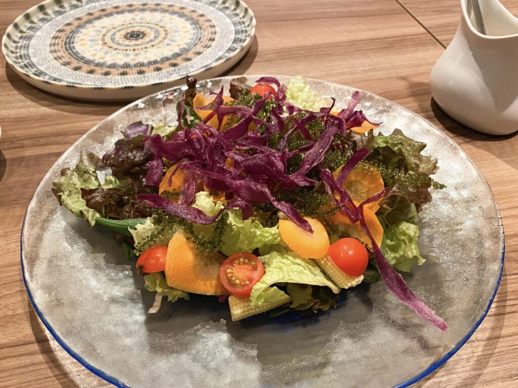 海ぶどう入りのサラダはボリューム満点で、野菜一つひとつの個性がしっかり引き立つ、魅力的な一皿でした。