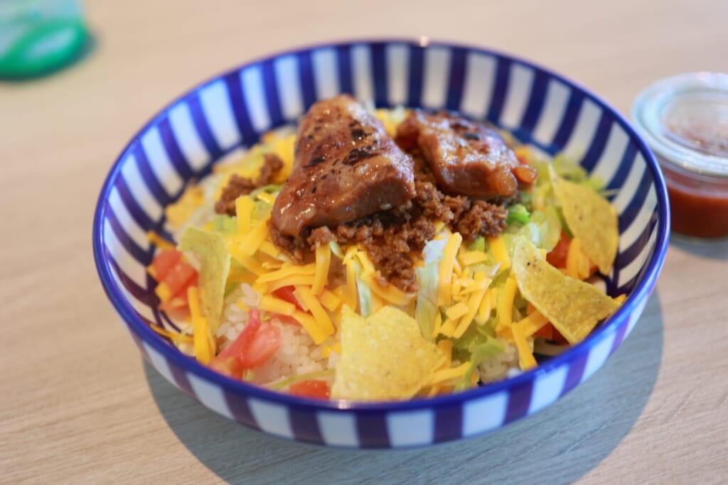 冷麺は、海ぶどうがきらめく沖縄風に仕上がっていて、見た目も味も大満足の内容。タコライスは、照り焼き風の鶏肉がどんと乗った食べ応え抜群の一品でした。