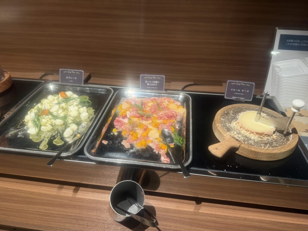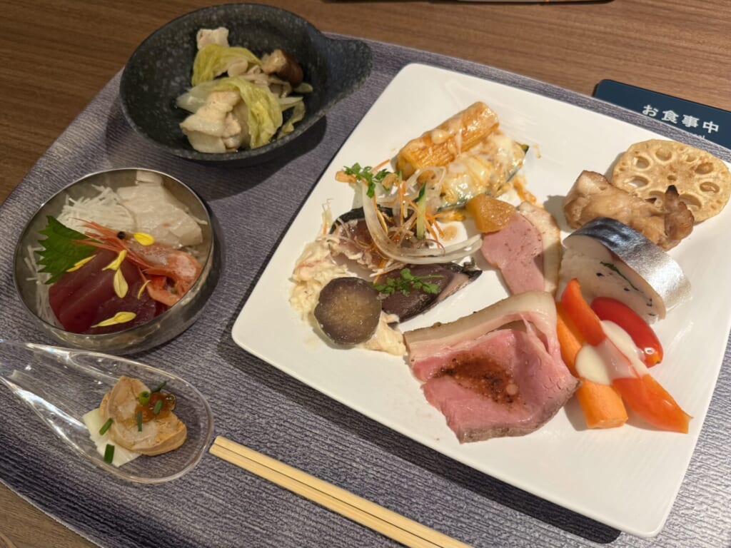 まずは夕食から。新鮮な海鮮を使ったお刺身や、豪華なローストビーフなど、とにかく種類豊富でつい目移りしてしまいました!(盛り付けが上手くなくてごめんなさい…)
