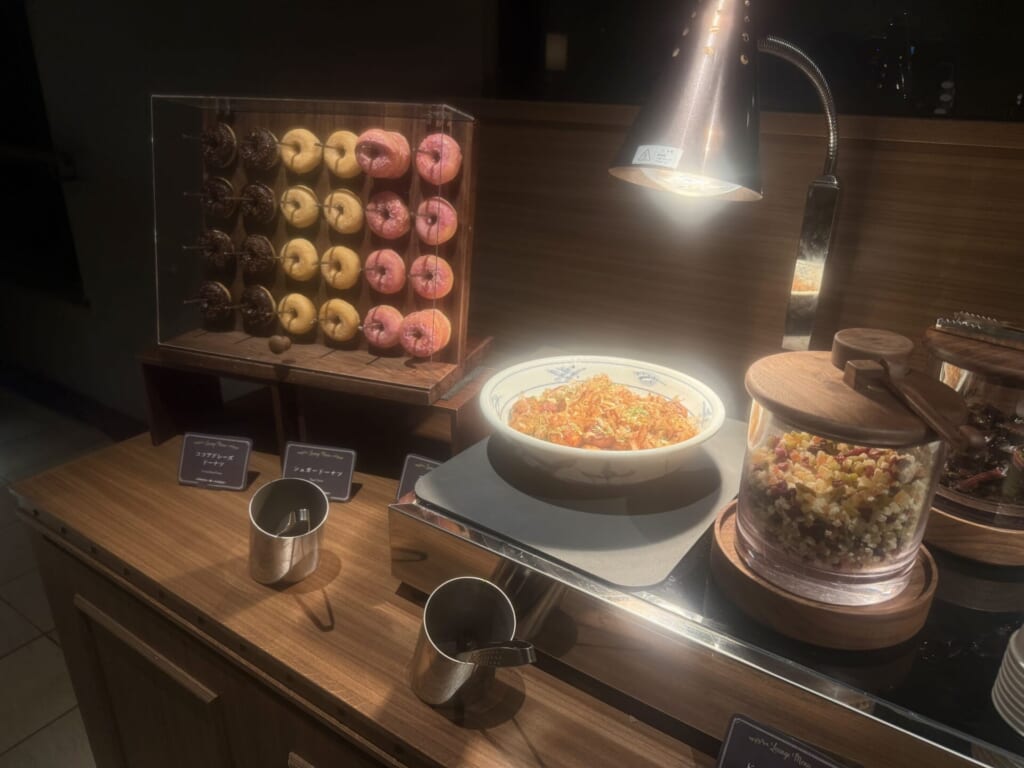 夕食後の時間帯には、ちょっとしたおつまみや見た目も可愛いドーナツが!夕食で既にお腹いっぱいでしたが、これらをつまみながら晩酌を楽しみました🍷(笑)