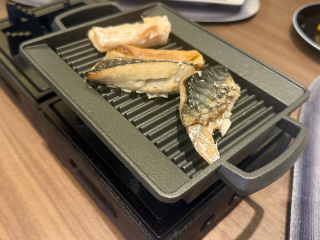 身の厚さに感動の焼き魚は、卓上にあるグリルで温めて焼きたてをいただくことができます。これが白米のお供にぴったりで、ついついたくさん食べてしまいました🍚