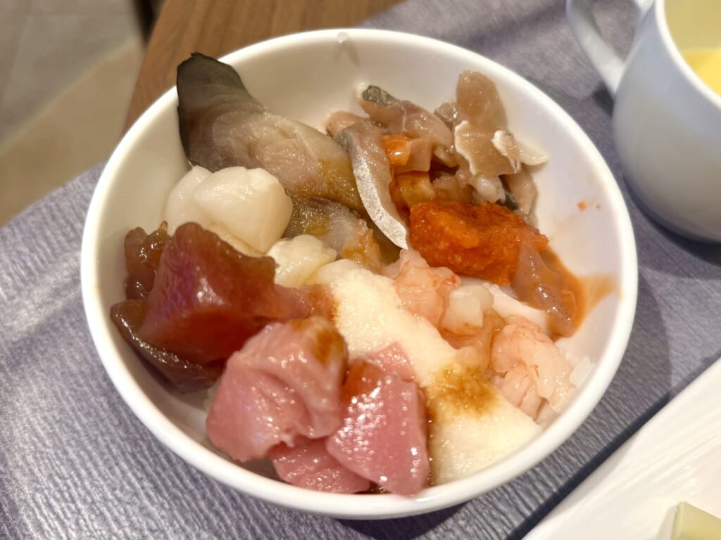 私が特に魅力に感じたのが、自分で好みの海鮮を乗せてつくる海鮮丼!✨マグロの赤身や中トロ、ホタテ、アジ、エビ、イカ、明太子など種類も豊富で、朝から贅沢気分を味わえました🥰