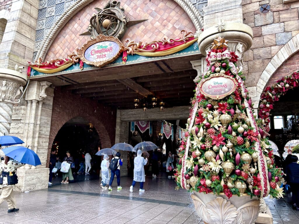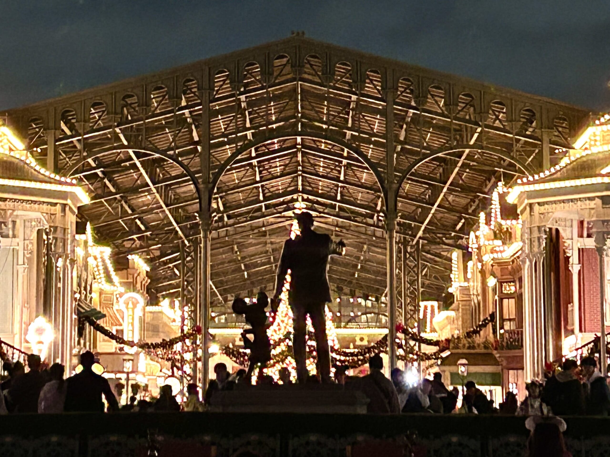 あえてシンデレラ城側からエントランスを撮影すると、ミッキーとウォルトディズニーさんがツリーを楽しんでいるみたい🎄✨