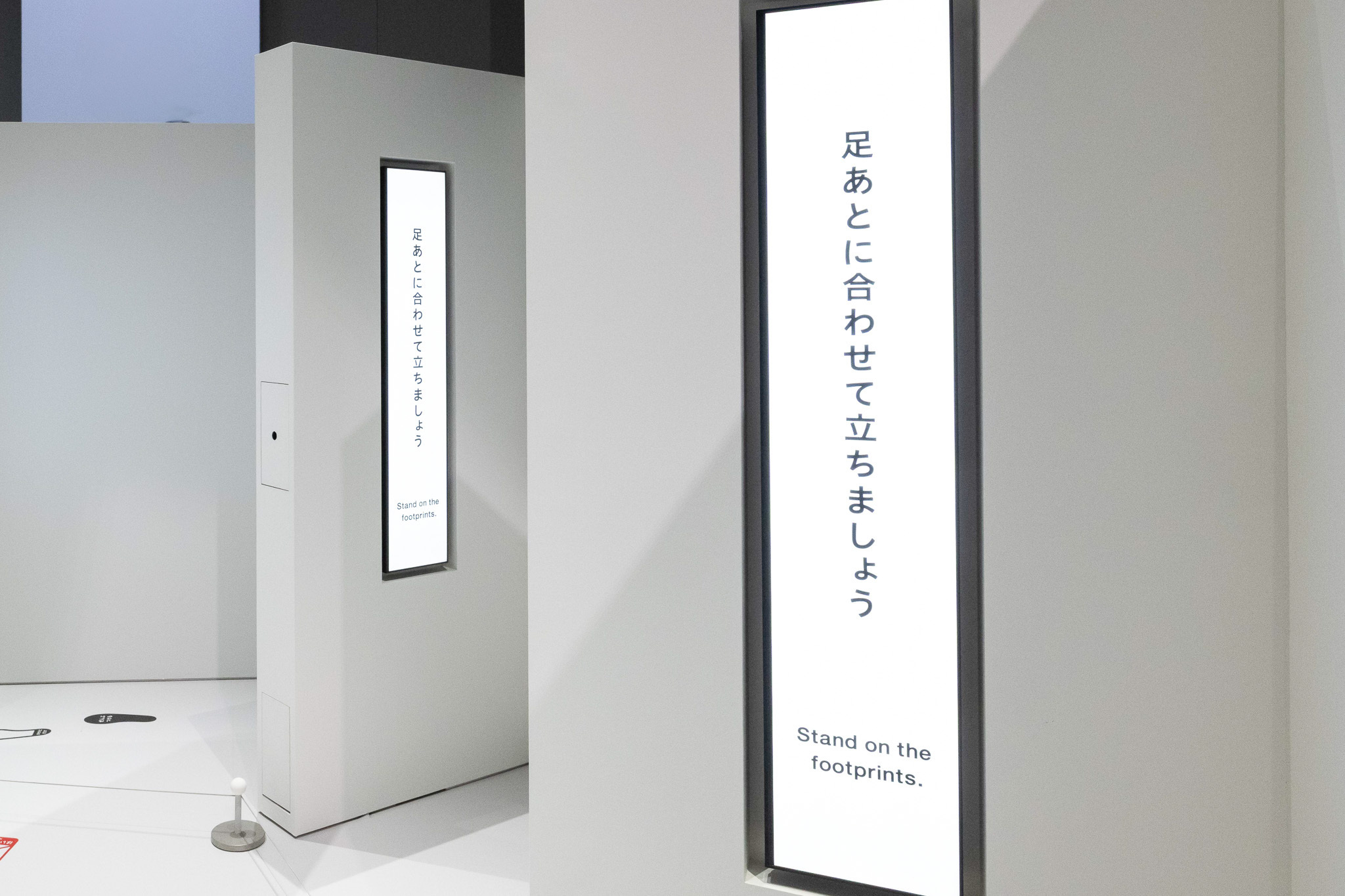 進んだ先に現れたのは、6つの小さな白いブース。それぞれの床には足型が描かれ、正面にはカメラが設置されています。そこに立ち、指示通りに足を置いて体を傾け、指定されたポーズを決めて“パチリ”。ただそれだけのシンプルな動作が、思いがけない体験へと変わるのです。