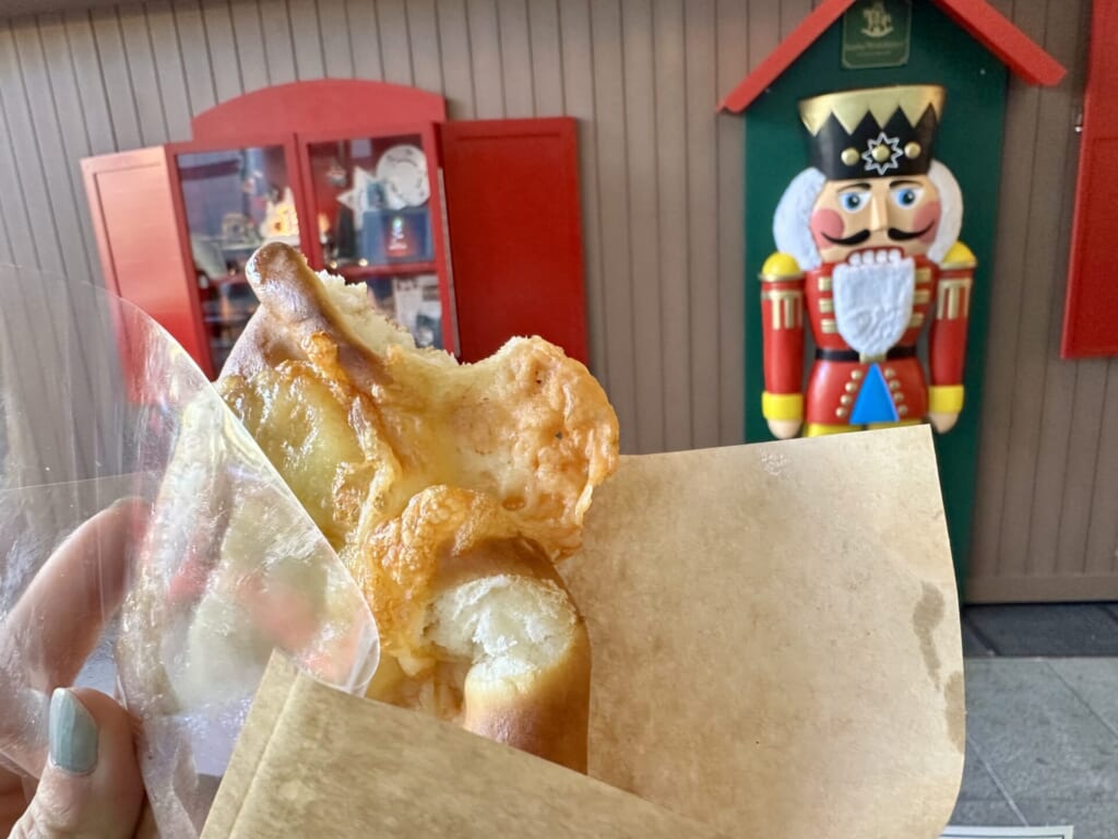 焼きチーズのプレッツェルは、外がパリッ、中はもっちり。噛むほど甘みと塩気のバランスが感じられて、ずっと食べていたい味。寒い屋外で食べると、さらに美味しさ3倍…!