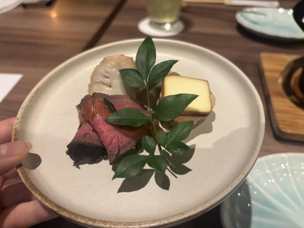 煎茶を使ったローストビーフ、お茶で燻されたチーズなど、旬の食材と合わせて調理したお茶料理など3種が楽しめます。ここでしか味わえないユニークなメニューが並んでおり、とてもワクワクする一皿です🍵