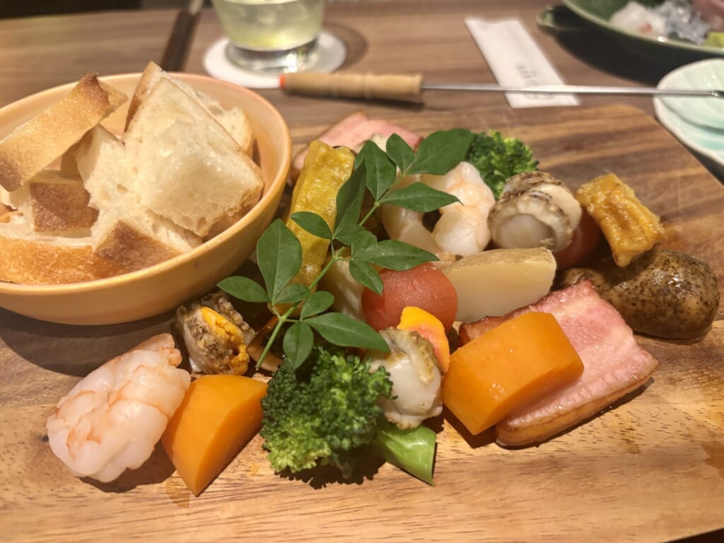 ディップする具材もユニークで、定番のバゲットや野菜はもちろん、オリジナルの「お茶ソーセージ」や、チーズと絡めるともっちり美味しい「お麩」、エビやホタテ、じゃかいもなど具材がお皿にたっぷりのっていました!何の食材が抹茶・ほうじ茶チーズが合うか試せるのが楽しいです👏