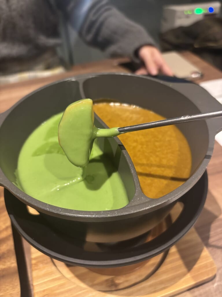 「抹茶チーズフォンデュ」のチーズには静岡県産の抹茶を使用し、ワインとチキンコンソメで味を加えてあります。「ほうじ茶チーズフォンデュ」には豆乳と味噌、コチュジャンを合わせることで味にコクをプラスしているみたいです。