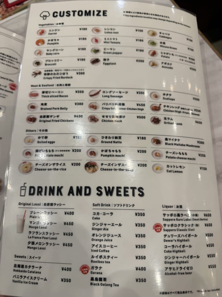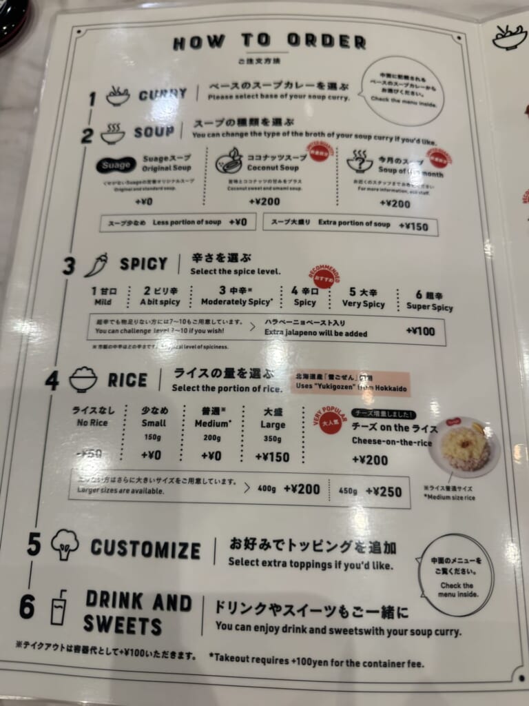 まずは、ベースのスープカレーを選びます!スープは定番のSuageスープの他、プラス200円でココナッツスープや今月のスープに変更可能です◎12月はエビのスープでした🦐