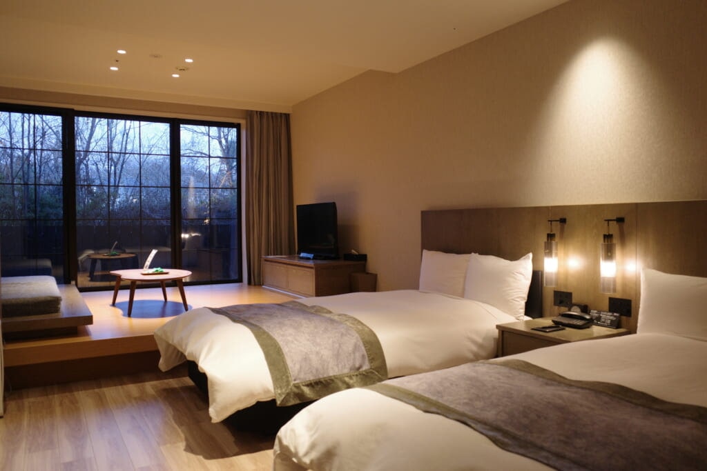 客室の扉を開けた瞬間、思わず「広い!」と声が出てしまう開放的な空間が広がっています。