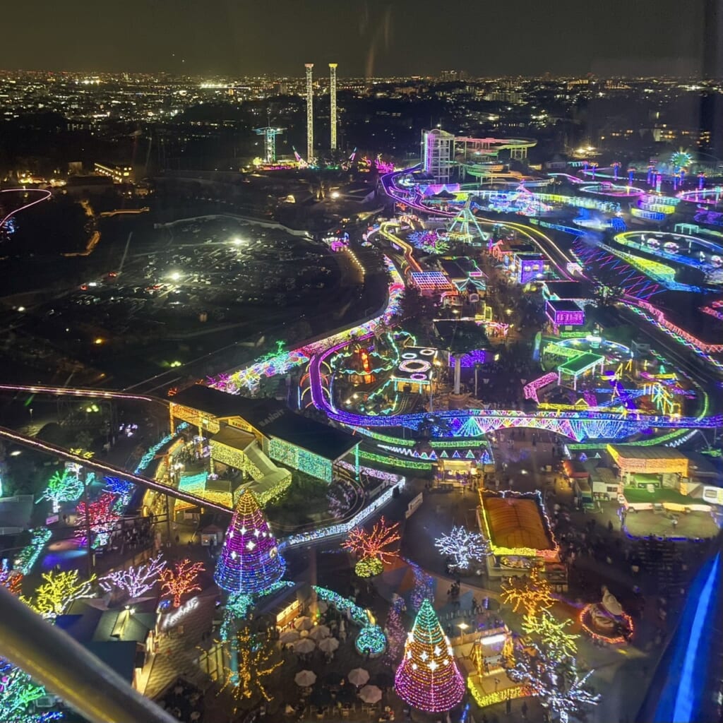 観覧車からは、園内一面に広がるジュエルミネーションを見下ろすことができます。高い位置から眺める宝石色の光は迫力があり、地上とは違った幻想的な景色を楽しめます。