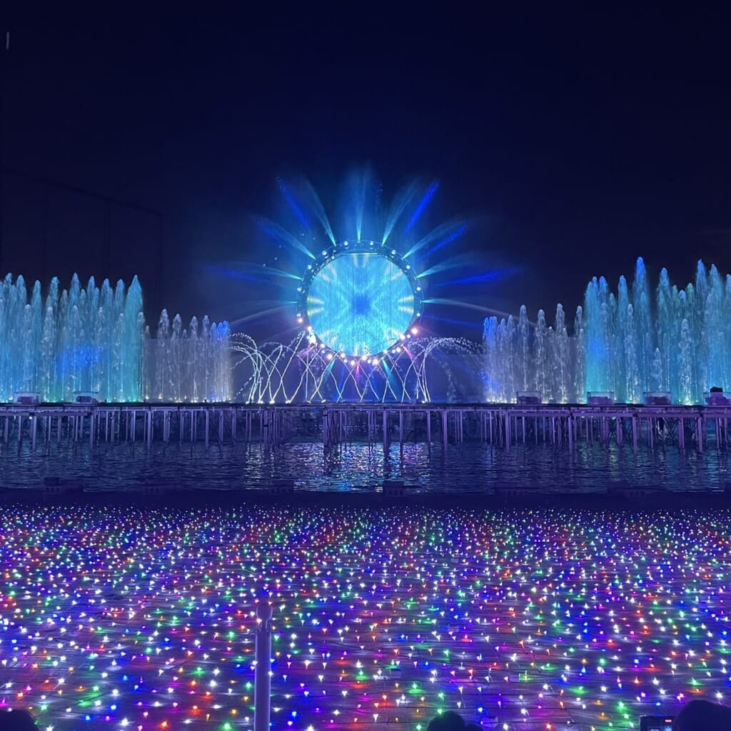 ジュエルミネーションと連動した噴水ショーは、音楽と光、水の動きが重なり合う迫力ある演出が魅力です。