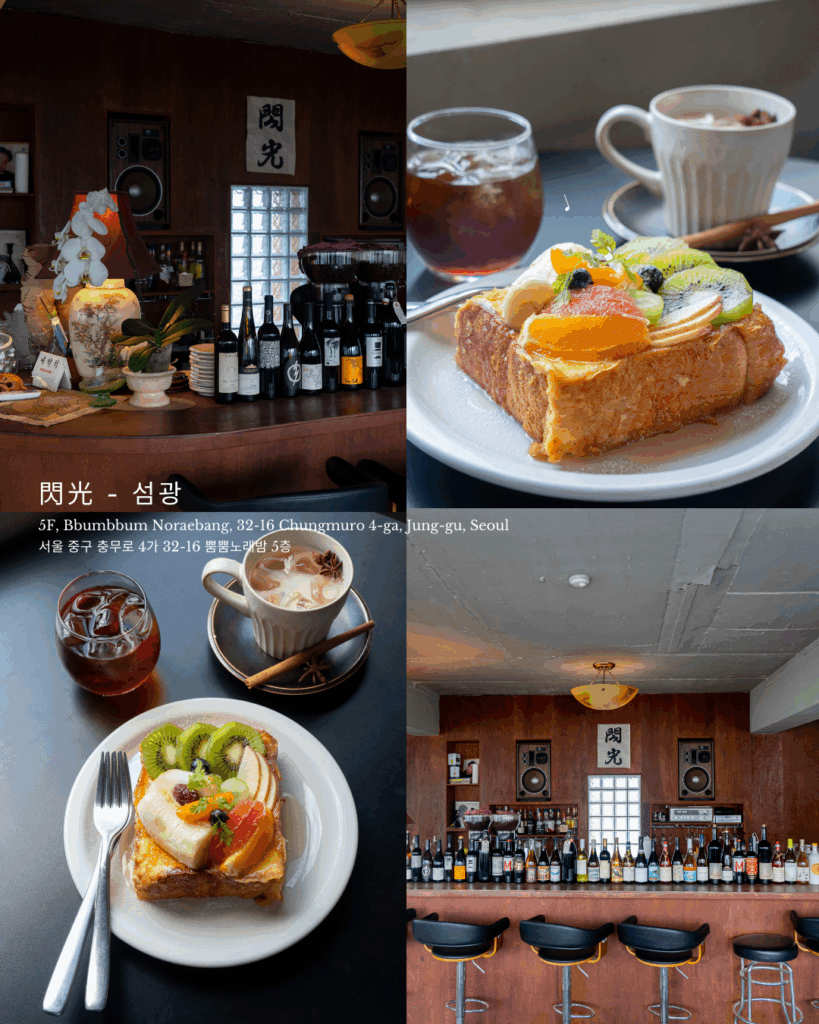 ソウル・忠武路にある、隠れ家のような感度高めカフェ。雑居ビルの上階にひっそりと佇み、扉を開けると外の喧騒を忘れさせてくれる落ち着いた空間が広がります。感度の高い人が集まる一軒。看板メニューのフルーツフレンチトーストは、卵液がしっかり染み込んだパンに、季節のフルーツを贅沢にオン。甘さは控えめで、最後まで軽やかに楽しめるのが魅力。
