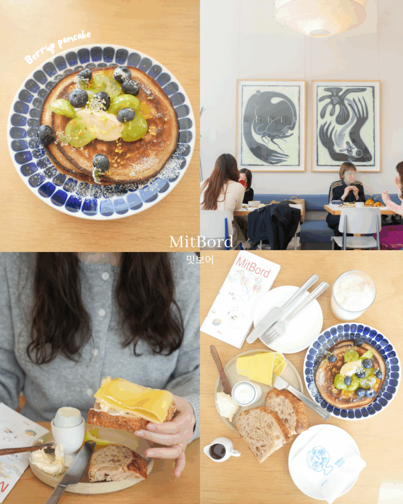 ソウル・聖水(ソンス)エリア、ソウルの森からほど近い場所にあるデンマーク発のブランチカフェ「MitBord」。朝から店内はほぼ満席になるほど人気で、現地の人たちにも親しまれている一軒です。デンマークらしいシンプルなインテリアに、パステルカラーの差し色が映える店内は、自然光が心地よく差し込む落ち着いた空間。