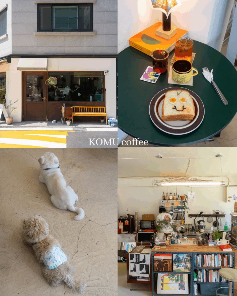 ソウル・成北区、ポムン(보문)エリアにある小さなカフェ「Komu」。静かな場所に佇み、木製家具やヴィンテージ雑貨を配した温かみのある空間が広がります。
