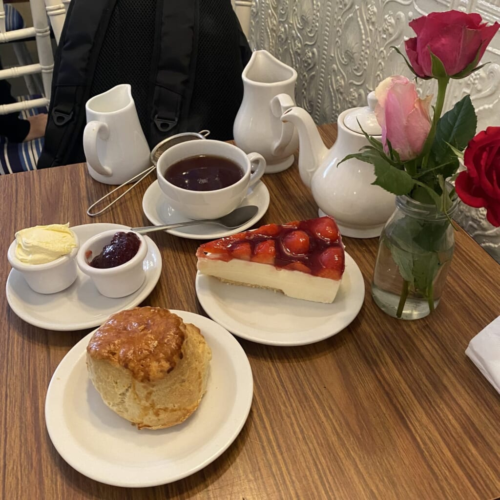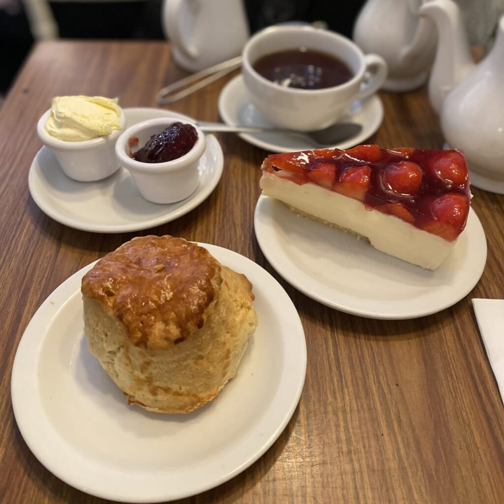 おっきなスコーンとストロベリーチーズケーキをチョイス!😂飲み物は、普段はブラックコーヒー派ですが、せっかくイギリスにいるので紅茶をいただきました🫖