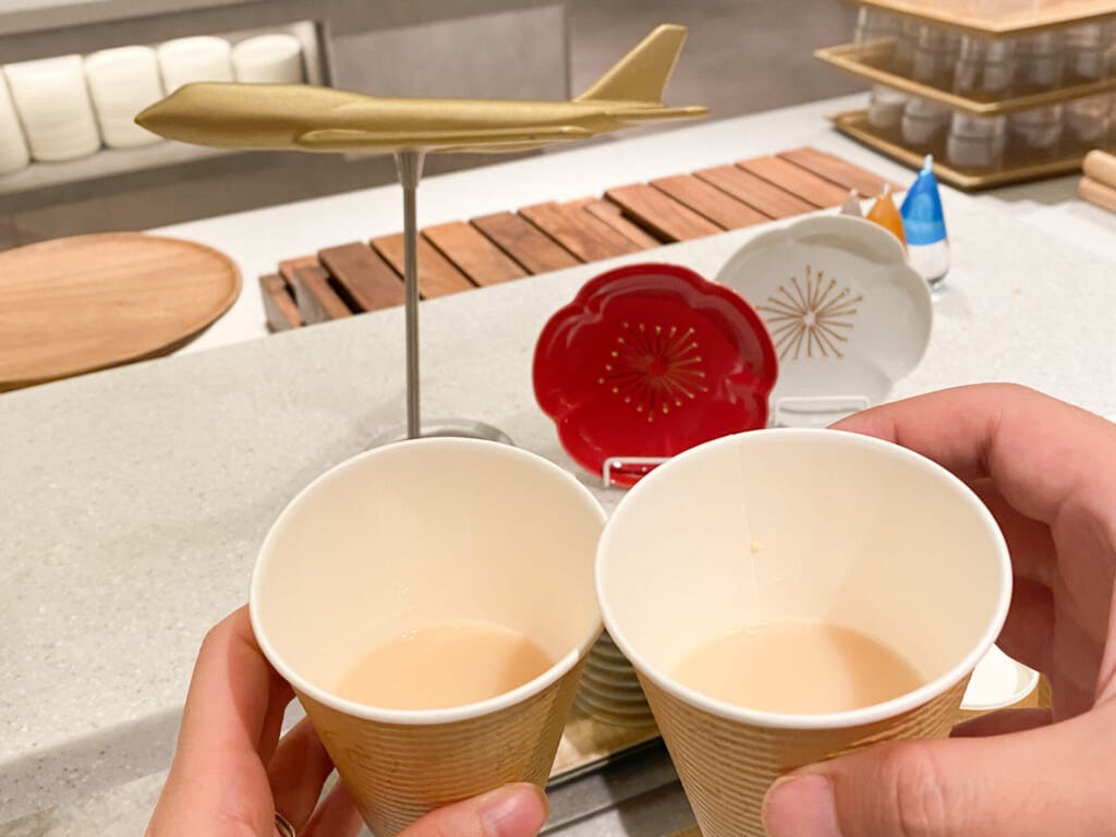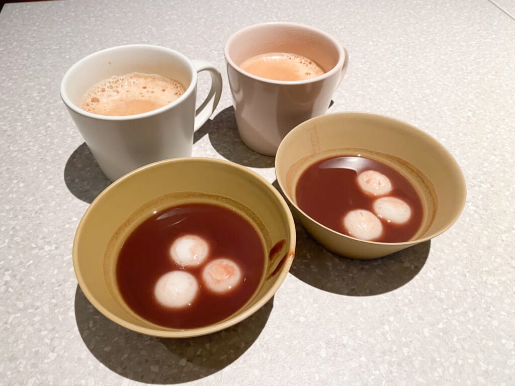 ◼︎ラウンジで甘酒とおしるこ、紅白キャンディの振る舞い