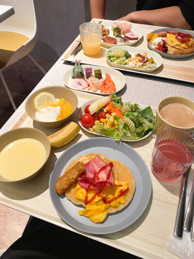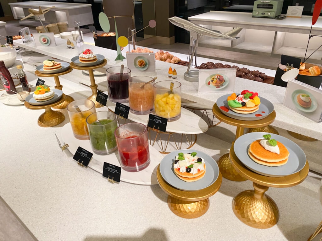 「OMO関西空港 by 星野リゾート」の朝食の名物はパンケーキ。ライブキッチンで焼きたてを受け取り、お好きなフルーツやおかずをトッピングして自分好みにアレンジできます。