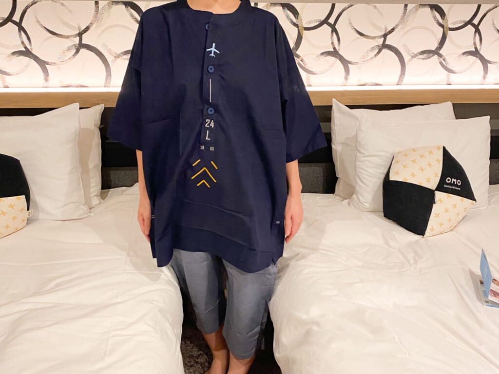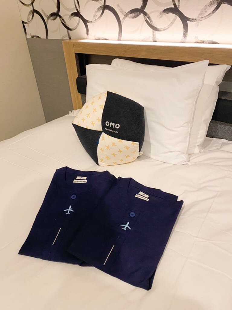 客室は、シンプルな作り。ベッドの上のクッションやルームウェアには飛行機のモチーフが描かれていて、そのかわいさにキュンとします♡