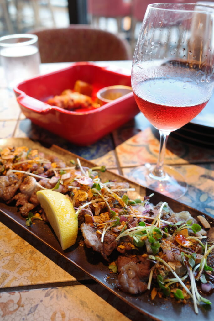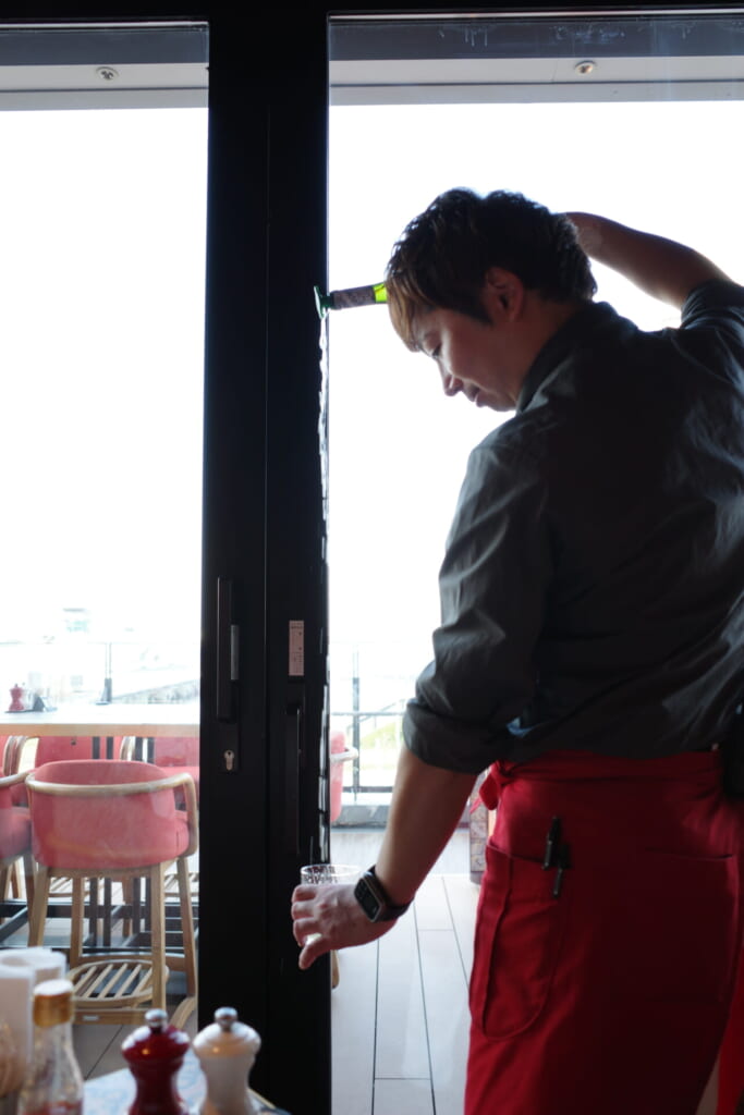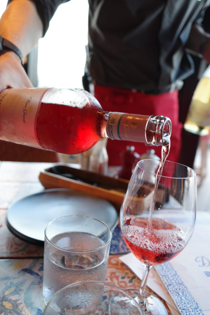 まずは、スペイン・バスク地方の名物ワイン「チャコリ」で乾杯。 スタッフの方が高い位置からグラスに注いでくれる形でサーブされます。あえて空気に触れさせることで香りが一気に引き立ち、酸味がまろやかになるんだとか!