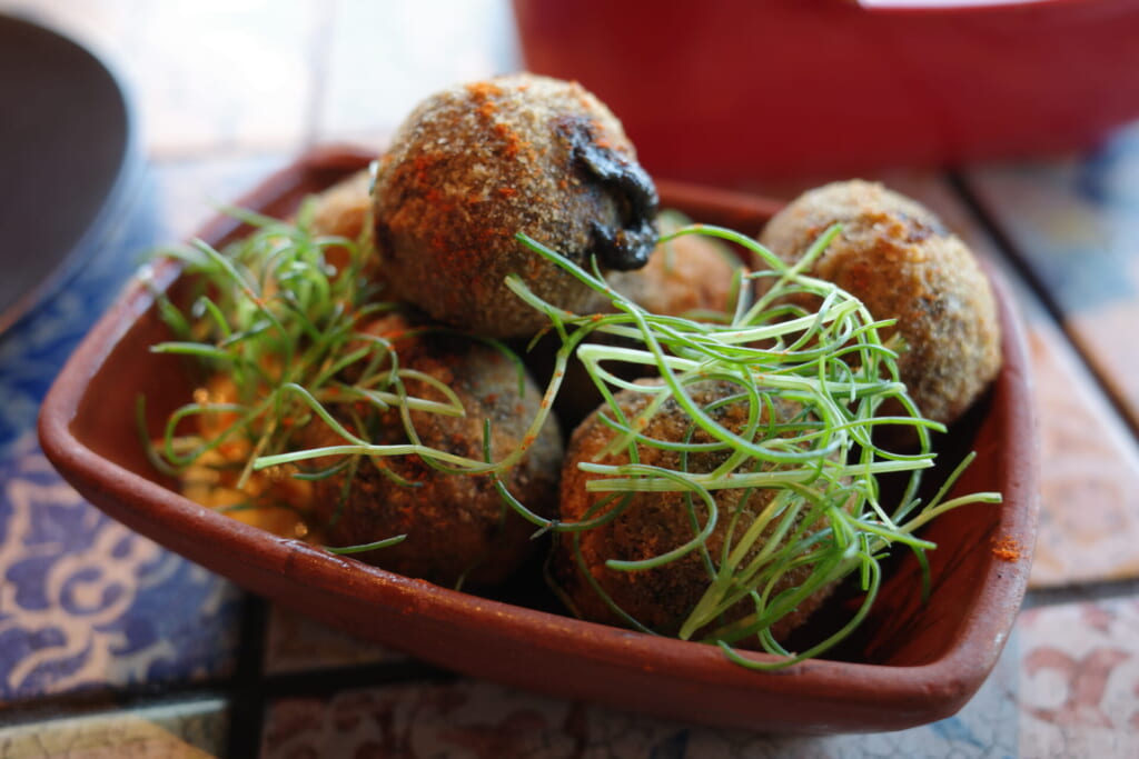 サイドには「クロケッタス・ネグロ イカ墨のコロッケ」を。一口サイズの中に磯の香りがギュッと詰まっていて、つい手が伸びてしまう逸品です。
