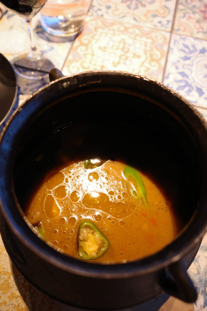 そして〆には、大好きなスペイン風雑炊「天然花海老と旬の野菜のアロス・カルドソ」をオーダー。 パエリアとはまた違う、スープたっぷりのリッチな一皿。魚介の旨みが凝縮されたスープが五臓六腑に染み渡り、まさにフィナーレにふさわしい贅沢感でした。