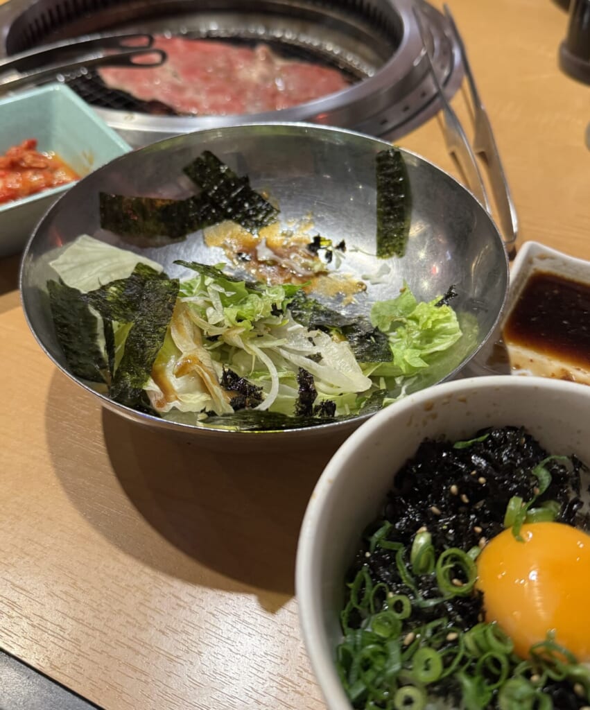 まずはお肉と韓国海苔ご飯、チョレギサラダやキムチなどたくさん頼んでいきます。