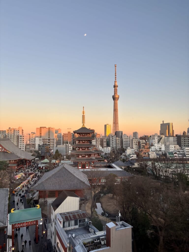 浅草寺の五重塔や本堂がすぐ目の前に迫る圧倒的な景色が広がっています。昼間と夕方で全く違った雰囲気なのがとっても素敵でした🥹