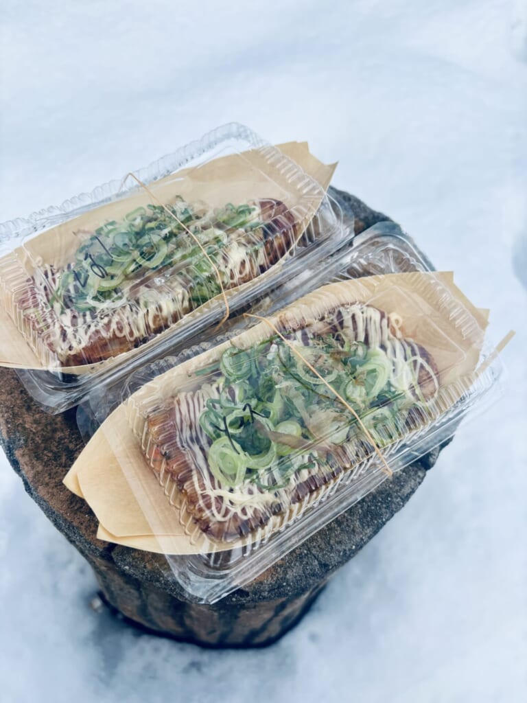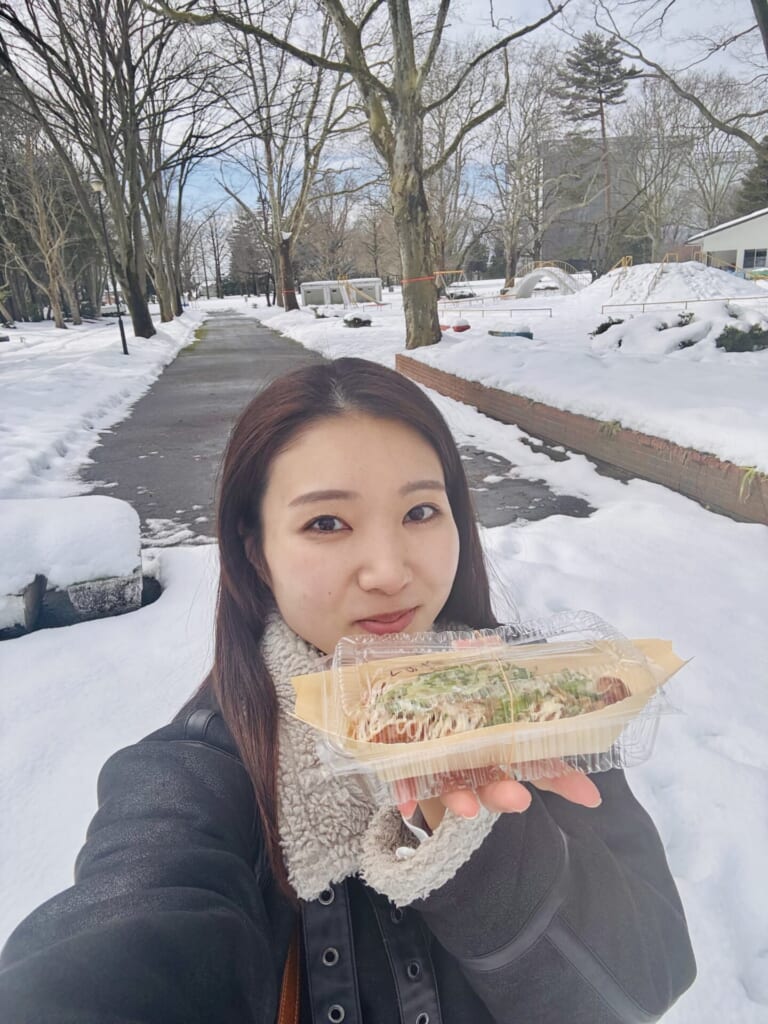 雪でいっぱいの誰〜もいない公園にてウキウキでたべました。🐙