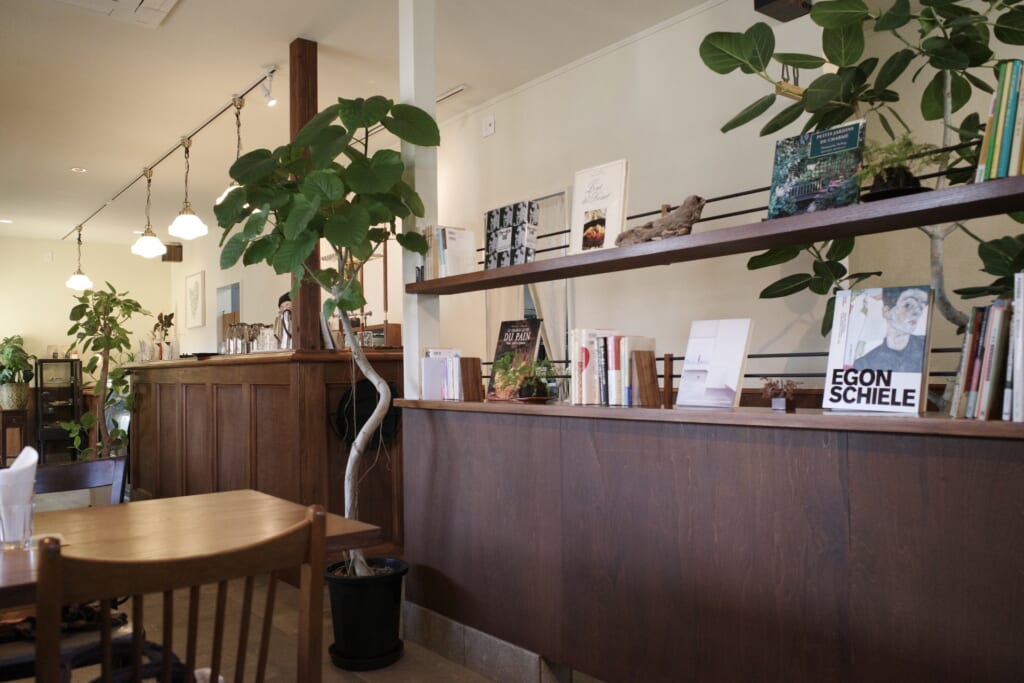 「ema」の魅力は、なんといってもその落ち着いた雰囲気。店内には本や雑誌があり、ゆっくりと楽しむことができます。