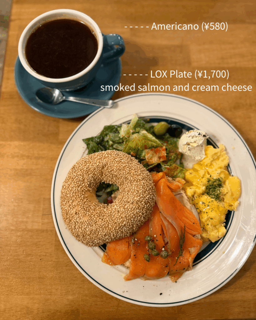 ベーグルプレートは全部で3種類。私はスモークサーモンとクリームチーズを使った「LOX」をセレクト!他にはBLTとガーリックシュリンプがありました。