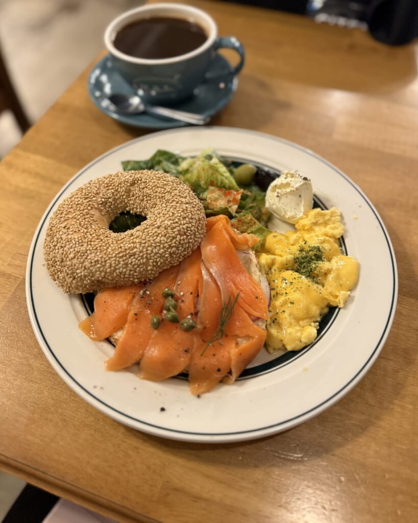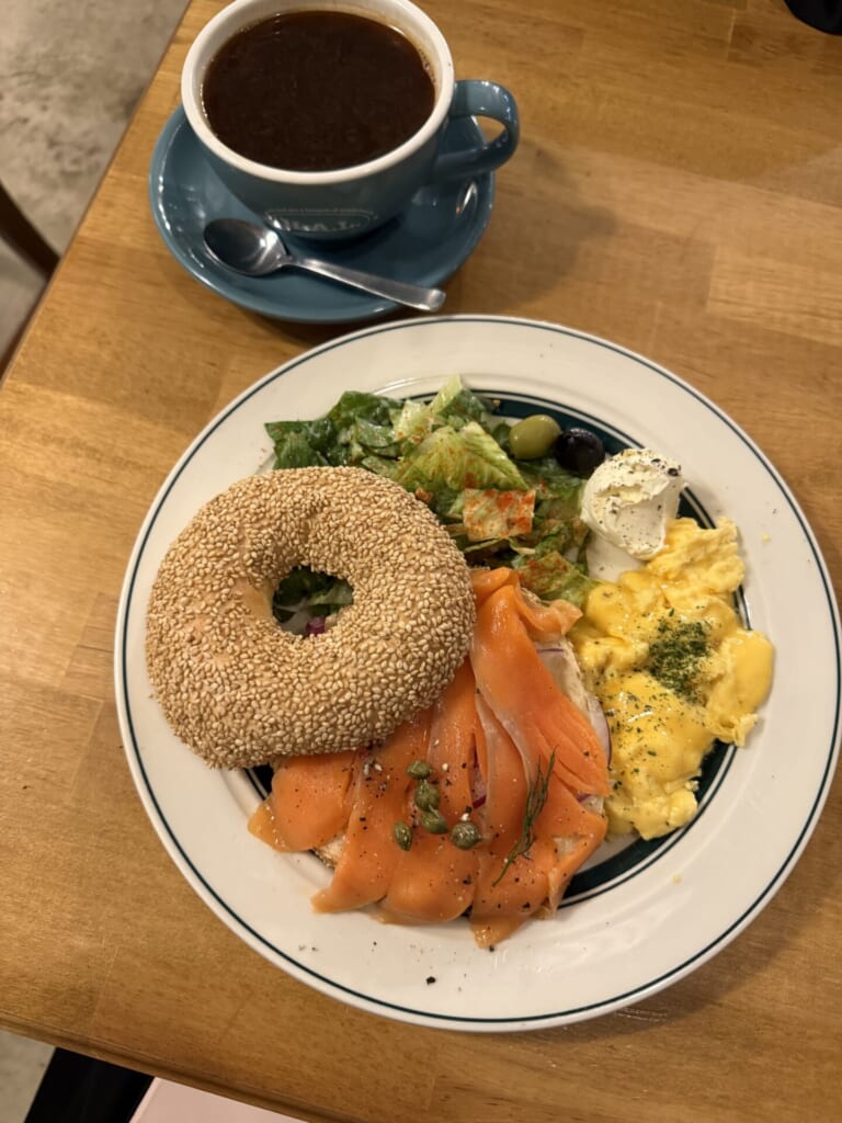 たっぷりのサーモンとクリームチーズが、ベーグルとの相性抜群!スクランブルエッグとサラダも付いており、ボリュームも満点です!
